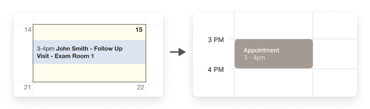 For example, when someone subscribes to your calendar in Google Calendar, Apple Calendar, or Outlook, they’ll see a time block labeled “Busy xx-zz” with no patient names, notes, or other information about the visit.